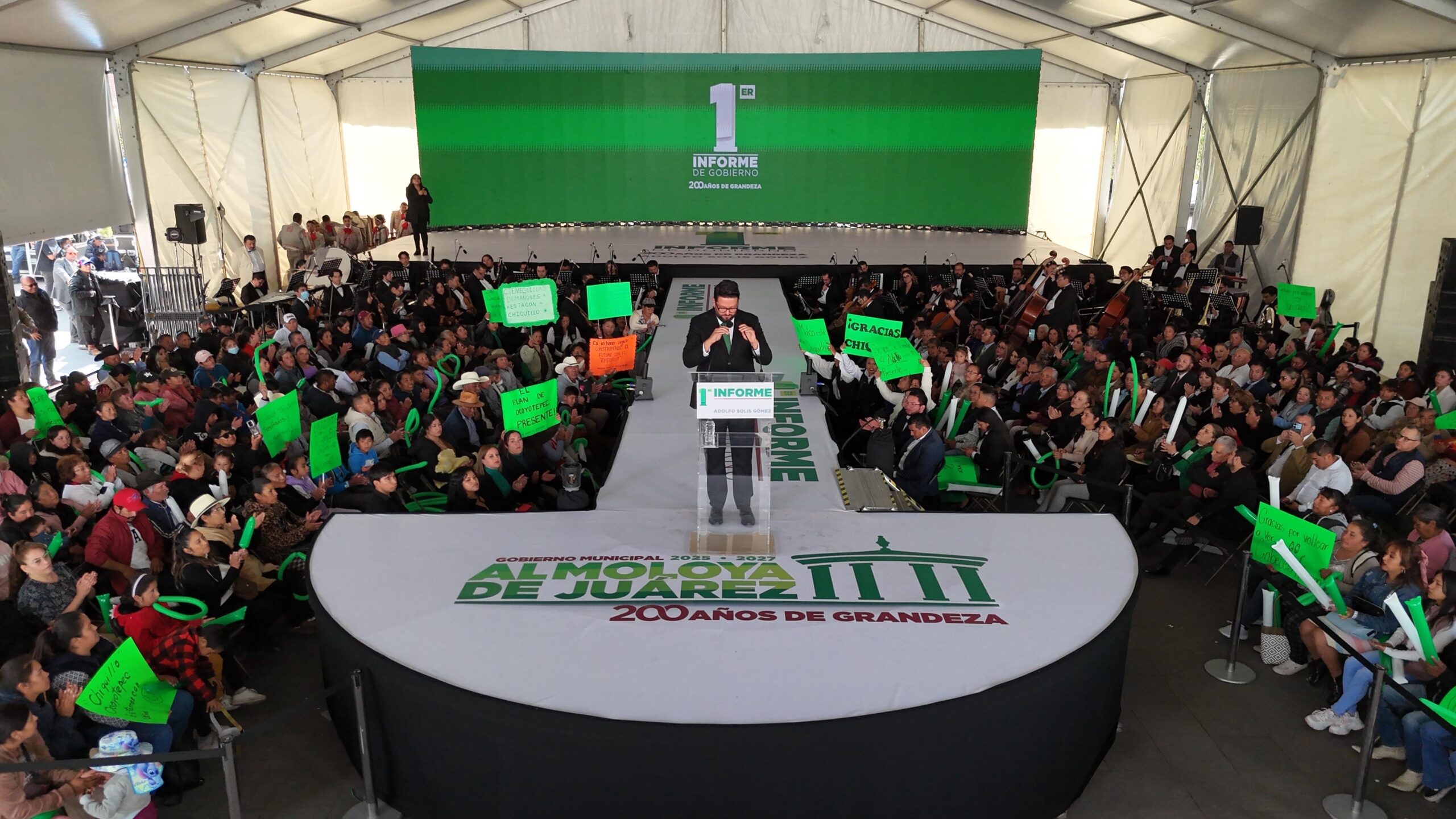 Con un llamado a la unidad, la transparencia y el trabajo conjunto para recuperar la grandeza del municipio, el Presidente municipal de Almoloya de Juárez, Adolfo Solís Gómez, presentó su Primer Informe de Gobierno ante más de mil ciudadanas y ciudadanos reunidos en la explanada central, donde fue arropado por autoridades estatales, liderazgos políticos, exalcaldes, diputadas y diputados, así como figuras sociales y comunitarias que reconocieron los resultados durante su primer año de gestión.