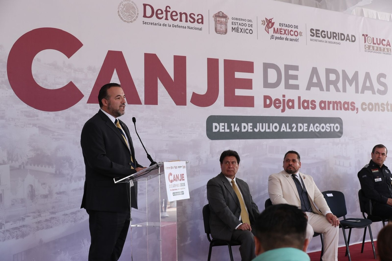 Toluca, Estado de México, 14 de julio de 2025.- El Gobierno municipal apoya el programa federal de Canje de Armas 2025 de la Secretaría de la Defensa Nacional (SEDENA) con un módulo instalado en la Plaza Fray Andrés de Castro de Toluca, con el objetivo de recolectar armas de fuego, explosivos y artefactos de uso militar para prevenir riesgos en los hogares y evitar consecuencias legales.
