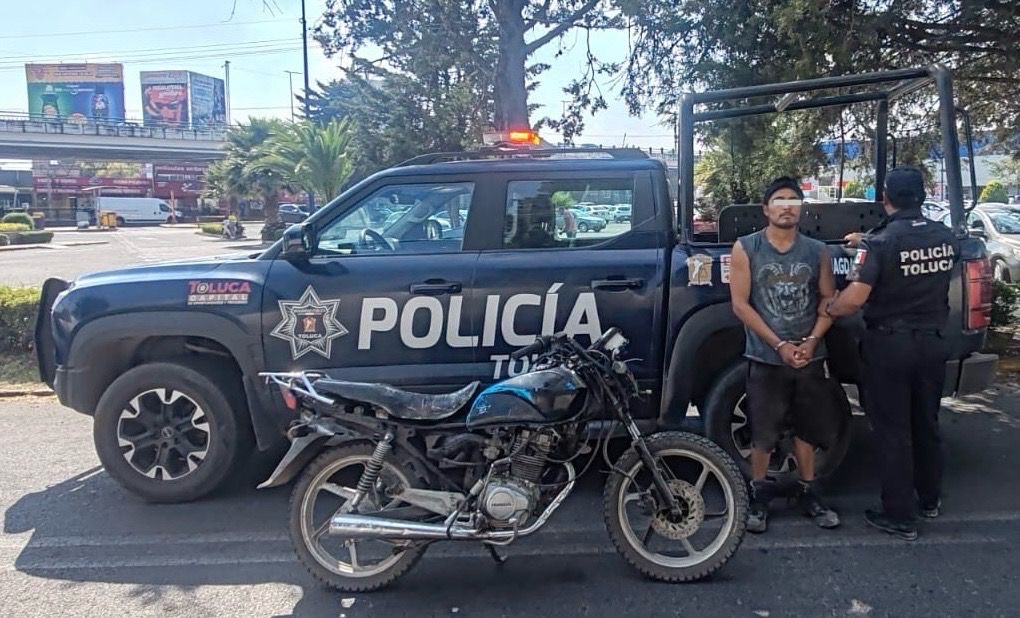 En la colonia San Diego de los Padres Cuexcontitlán, policías municipales aseguraron a Jesús Alberto “N”, de 27 años, luego de que intentara huir a bordo de una motocicleta negra sin placas. Al verificar el número de serie en Plataforma México, se confirmó que la unidad contaba con reporte de robo, por lo que el hombre fue detenido y trasladado a la Fiscalía Especializada en Robo de Vehículos.