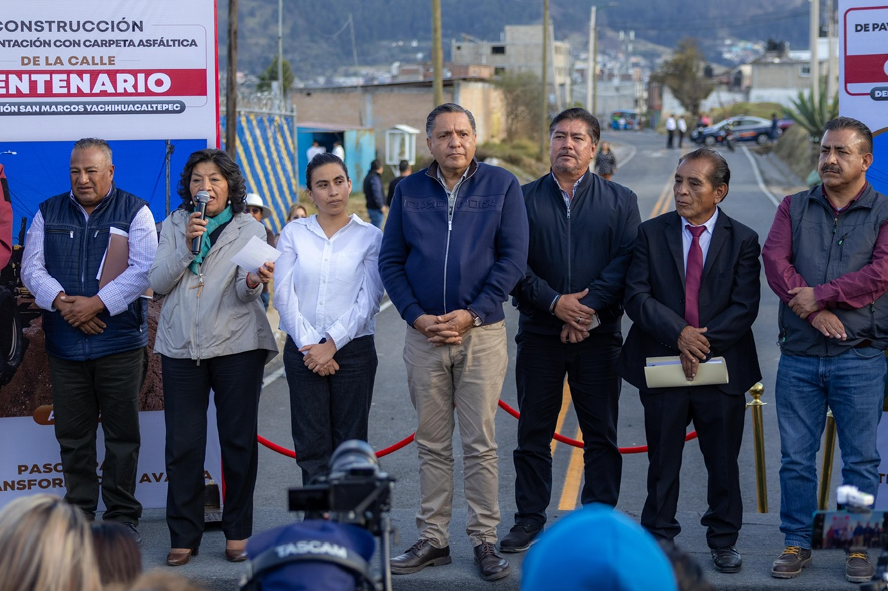 Toluca, Estado de México, 30 de enero de 2026.- Más de 10 mil personas que viven y transitan diariamente por San Marcos Yachihuacaltepec y Calixtlahuaca se beneficiaron con la pavimentación con carpeta asfáltica de la calle Centenario, inaugurada por el Presidente Municipal, Ricardo Moreno, como parte de su compromiso de elevar la calidad de vida de las familias.