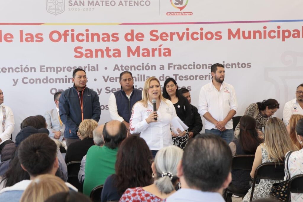 San Mateo Atenco, Estado de México, 18 de agosto de 2025.- La presidenta municipal Ana Muñiz Neyra inauguró en el barrio de San María, la primera Oficina de Servicios Municipales que desconcentra la atención a vecinas y vecinos de condominios y fraccionamientos, al sector empresarial y a emprendedores, donde también se ponen a disposición ventanillas del Organismo municipal de Agua y de la Tesorería.