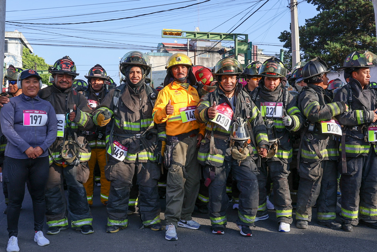 Más de 50 bomberas y bomberos de Toluca, municipios vecinos y Ciudad de México, corrieron al lado de la ciudadanía, portando su equipo de protección, que incluye pantalón, chaquetón, guantes, careta y Equipo de Respiración Autónoma (ERA), que añade entre 32 y 33 kilogramos de peso extra, demostrando así su fuerza, disciplina y compromiso.