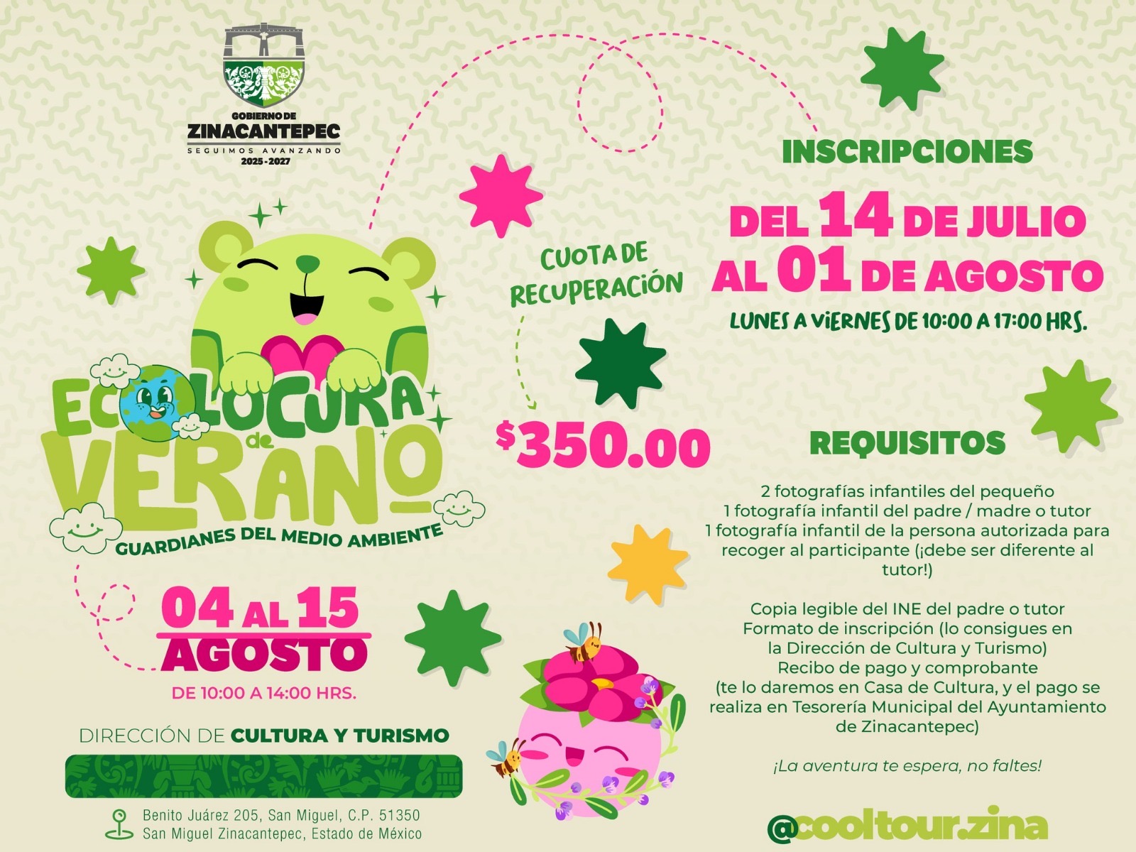 El curso se llevará a cabo del 4 al 15 de agosto de 2025, en un horario de 10:00 a 14:00 horas, este se impartirá en la Casa de Cultura “Matilde Zúñiga”, estará a cargo del personal de la Dirección de Cultura y Turismo; a través de esta iniciativa, los participantes podrán disfrutar de: actividades ecológicas interactivas, manualidades con materiales reciclados, juegos y dinámicas que promueven el cuidado ambiental, recorridos guiados por entornos naturales del municipio y premios e insignias ecológicas.