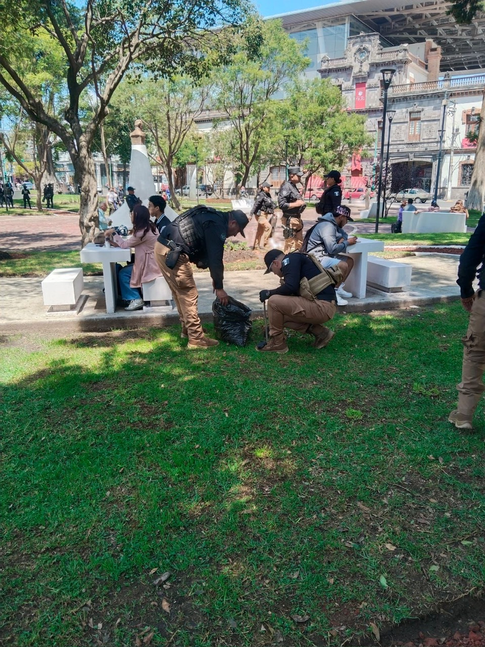 Toluca, Estado de México, 27 de septiembre de 2025.- Elementos de grupos especiales de la Policía de Toluca realizaron este día, una jornada de limpieza en el Jardín Zaragoza para reforzar la proximidad social y mejorar la percepción ciudadana sobre las fuerzas del orden.